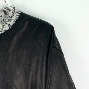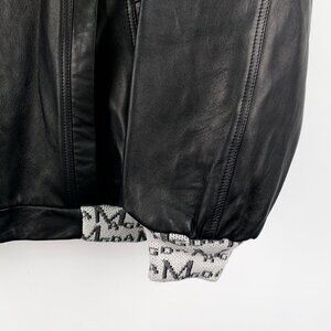 Magda Butrym black lambskin leather jacket featuring a stand collar, zip-front closure, and long sleeves. Sleek, modern silhouette.