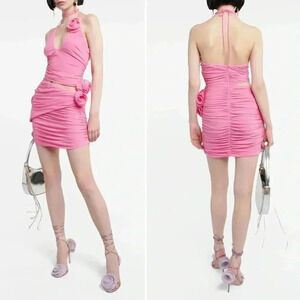 Magda Butrym dress, pink mini dress, silk jersey dress, rosette dress, ruched mini, designer cocktail dress, party dress, halter cutout dress, luxury eveningwear, made in Poland, IT 42 US 6