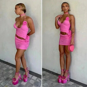 Turn heads in this stunning Magda Butrym Rosette Silk Jersey Minidress, a signature piece that perfectly blends femininity and modern edge. Crafted in a vivid pink hue, this figure-flattering design features ruched detailing, cutout panels, and Magda’s iconic gathered rosettes. The halter neckline ties elegantly at the back, creating a sculpted silhouette ideal for cocktail events, nights out, or special occasions.