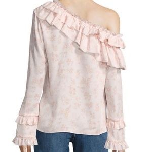 Magda Butrym georgette top featuring antique-style floral rose print.Approx. 19.5L down center back.Elasticized neckline with raw-edge ruffle. Size 34. Two small stains could come out at dry cleaner