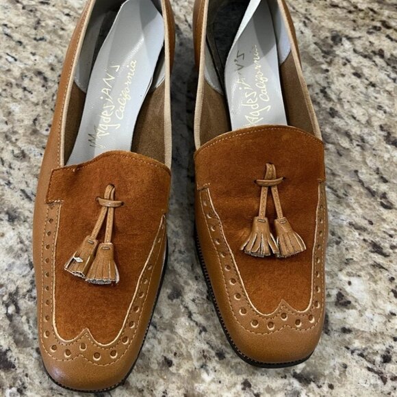 Add a touch of timeless sophistication with these vintage Magdesians California women’s loafers. Featuring a two-tone design with smooth brown leather and rich suede uppers, these slip-on shoes are accented with classic tassels and brogue-style detailing. A low block heel provides comfort while maintaining vintage charm.
