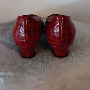 Step out in style with these elegant red leather women's kitten heel featuring a chic crocodile pattern. Size 9-1/2. Perfect for any occasion.