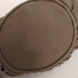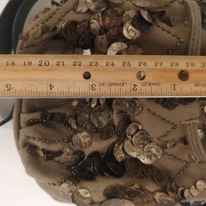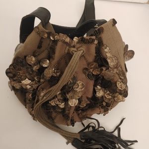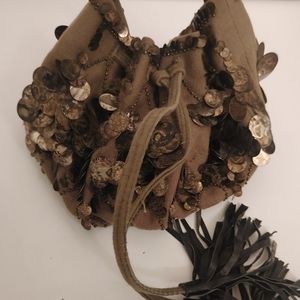 This is a Mage drawstring small size bag. Made of cloth with round metal embellishments. Good condition