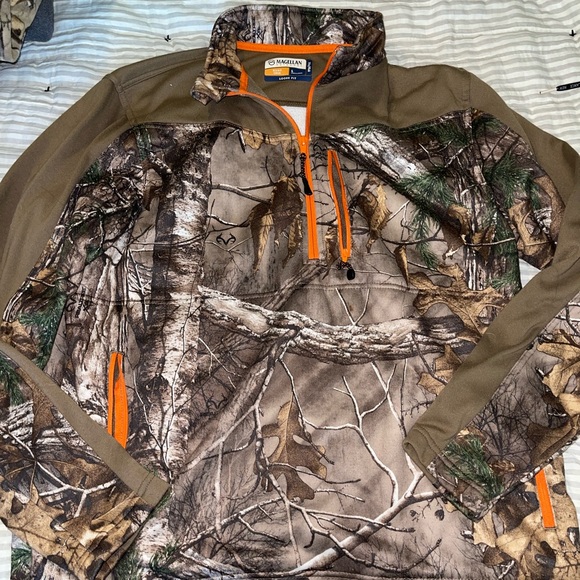 Is in worn shape because of the fabric having some balling up. Could easily be removed with lint shaver! Does have zipper pockets as well and is a loose fit