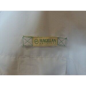 The Magellan Laguna Madre SS Lawnmower shirt is made from 100% polyester with UV protection, moisture-wicking properties, and breathability for comfort in any season. It features a relaxed fit, button-down collar, short sleeves, and a practical khaki color.