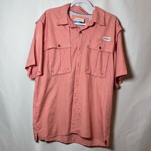 This Magellan Fish Gear Short Sleeve Button Up shirt was worn a few times. It is a relaxed fit and moisture wicking shirt. The colors are orange and white check and size large.