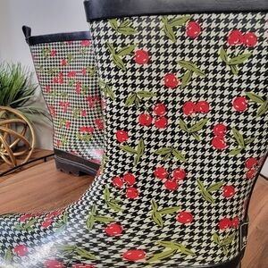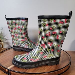 Black and white Houndstooth and red cherry printed rain boots. Slip on style. Back pull tabs.