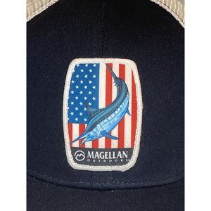 Magellan Marlin Fish USA American Flag Patch SnapBack Hat Cap Blue Fishing NWT.