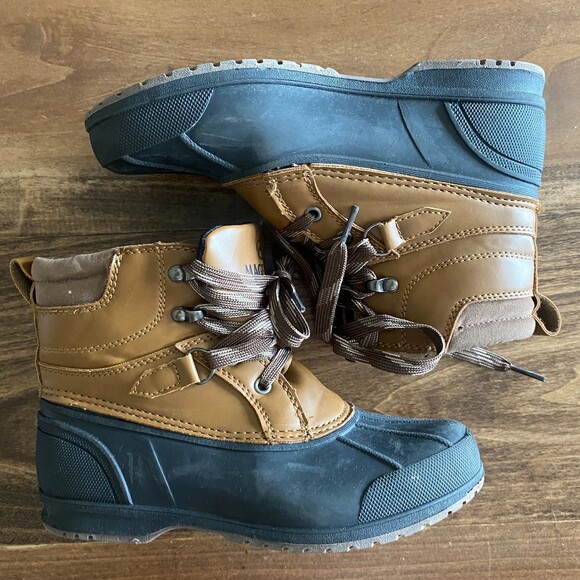 Magellan Outdoors duck boots, youth 2. Lace-up, ankle height, leather & rubber upper, textile/fabric interior, light wear on heel of shoe, great tread, clean exterior/interior, a few spots or wear as pictured, great for many outdoor activities.