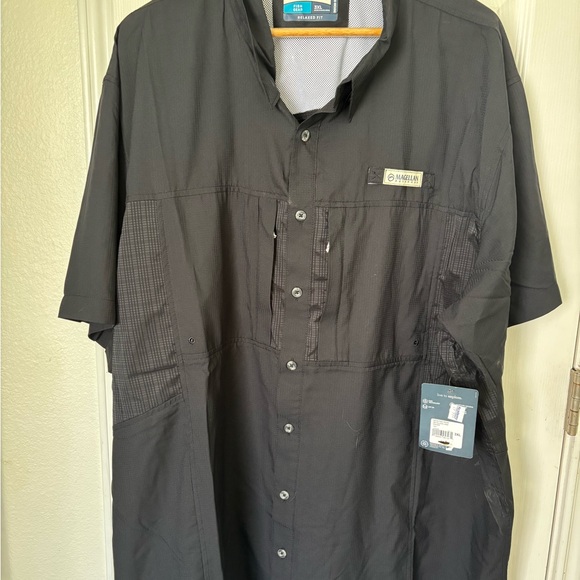 Stylish black button down. Ideal for casual wear. Features short sleeves and a comfortable fit. Moisture-wicking. New with Tags