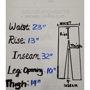 Measurements from photo (laying flat): Waist 23 in, Rise 13 in, Inseam 32 in, Leg opening 10 in, Thigh 14 in