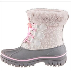 The Magellan Outdoors Youth Cheetah Duck Boots are made with waterproof shells and fleece linings. Cozy collars for warmth. The cheetah print adds a fashionable touch. TPR outsoles. Lace up.