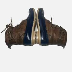Good preowned condition. Rubber and vegan leather. Stylish navy and brown pairs well with jeans. A couple of wear areas as shown in photos but does not affect keeping feet dry.Priced to reflect.