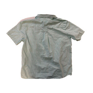 Short sleeve collared button up shirt with green and white gingham plaid pattern