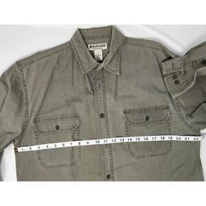 Magellan Sportswear Long Sleeve size Medium. Shoulder to bottom of shirt 31 inches long. Shoulder to Collar 7.5 inches long. Armpit to armpit 22.5 inches across. Shoulder to wrist 23.5 inches long. Very light spot with discoloration near wrist of right sleeve as seen on photo.