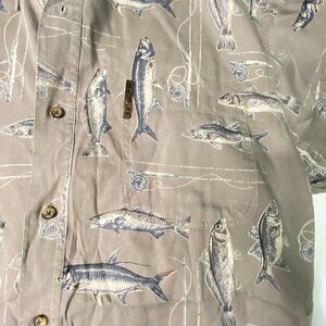 Magellan Sportswear Size Medium Short Sleeve Fly Fishing Print Shirt Green Tan