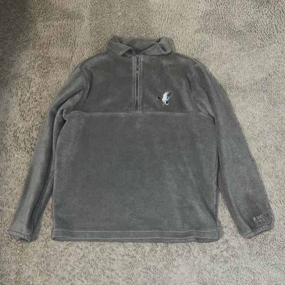 Zips up top. Has duck on front. A greenish color. Very soft