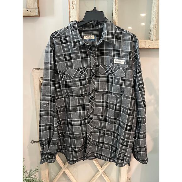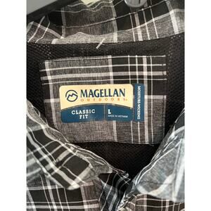 Magellan size large black and gray button down shirt in excellent condition. 24” from pit to pit and 32” long. It has ventilation.