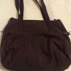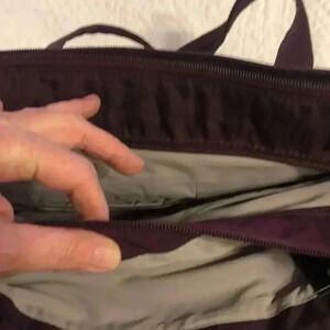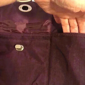 Magellan’s purple nylon shoulder bag. Two compartments on front. Three separate zippered compartments including RFID protected card slots.
