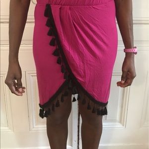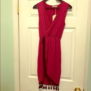 Magenta Colored Sleeveless Faux Wrap Tassel Dress