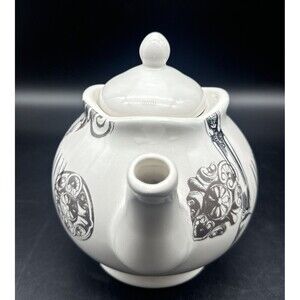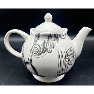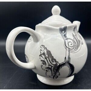 Magenta Exclusives White w/ Black Fork Spoon Knife Graphics Ceramic Teapot 80oz