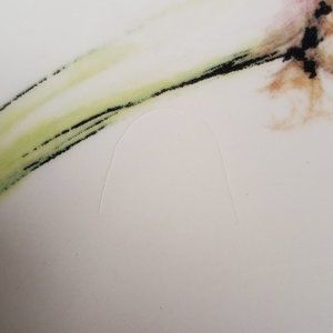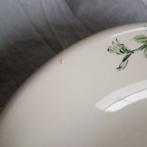 Beautiful large ceramic bowl in a minimalistic food design! I used this piece when I dabbled in food photography and I absolutely enjoyed how much things you can pack in there. Flaws include a tiny spot of chipped paint on the top brim, a hairline crack on the inside, and slight discoloration on one side. These flaws are very minor and I believe that the chipped paint is actually just a missed spot of paint. Dishwasher safe.