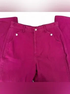 Bold magenta high-waist jeans. Classic five-pocket styling with silver-tone hardware. Vibrant solid color ideal for statement looks.