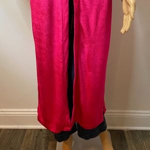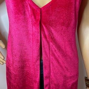 Super chic timeless and vintage very sixties seventies boho glam magenta velour duster tunic. It’s sleeves and is maxi length. The back looks like a dress to the floor shift style and the front has a deep v neckline with two clasps for closure at the bust line. There are two long layers on each side with two slits on each sides so it’s a very versatile piece that can be worn in so many fun ways. It would be a bathing suit chic cover up or cool with shorts for a dramatic look. Message for details