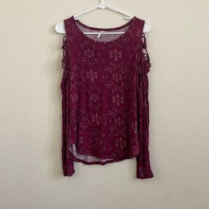 This magenta top is super soft, comfy, and features an adorable strappy cold shoulder design! Size medium. Great condition!
