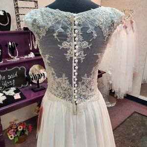 Beautiful modest high tulle and lace neckline and back with chapel length chiffon skirt!