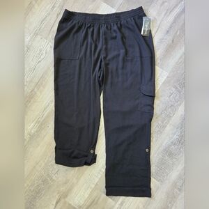 New w/tags. Black. Women's size 1X. These are lightweight and flowy. Have a tiny ripple pattern throughout with an elastic waist. High-rise. They're designed to be worn as regular length pants or can be buttoned up into stylish capris. They have two side pockets and a fun cargo pocket on the left leg. Can be worn as casual or semi-casual. Perfect for a stylish day out, office, date-night, vacation, bohemian, multi-season, fancy, etc.