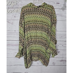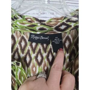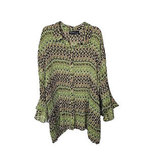 Maggie Barnes Green Ikat Print Bell Sleeve Button Down Tunic Top Womans Size 4X