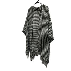 • Tags: poncho, houndstooth, fringed poncho, Maggie Barnes, black and white, acrylic poncho, winter layering, professional wear, stylish poncho, outerwear, Korean made, dry clean only, brushed acrylic