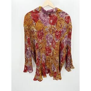 Red and orange floral print pleated button down tunic top. Collared neckline, ruffle hem, long sleeves.