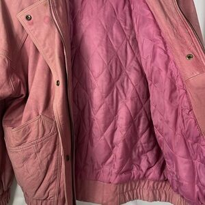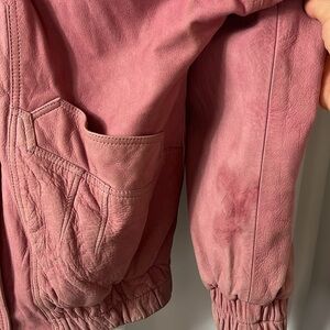 Maggie Lawrence pink leather zip/snap close fox fur trim bomber jacket Sz M PINK