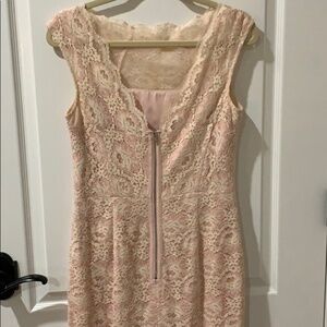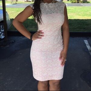 Stand out in this beautiful feminine light pink and ivory lace sheath dress by Maggie London. Exposed Zipper back with "V". Cap sleeve. Perfect for that special occasion. Worn once