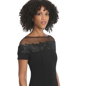 Maggie London illusion dress with applique of roses across the yoke, giving it an