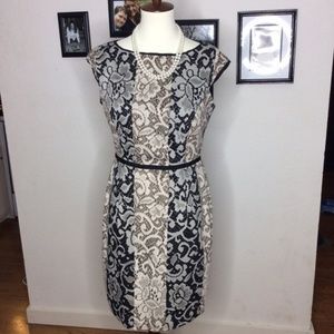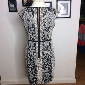 Classy and beautiful Maggie London Sheath Dress with pretty printed floral lace and cute zipper detail down the back. Perfect addition to your fall wardrobe. Tap and bottom of dress has a nice stretch. Waist is structured.