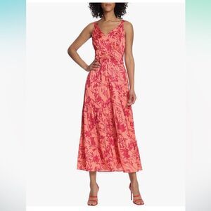 Maggie London Ruched Tiered Skirt Maxi Dress Size 12 Petite in Coral and Pink