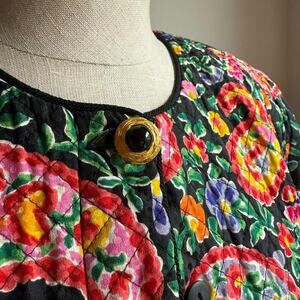 Vintage Maggie London silk quilted jacket featuring a vibrant multicolor paisley and floral design. This cropped statement jacket is made from 100% silk with a structured, quilted finish. The round neckline and bold oversized button closure add an elevated retro feel.