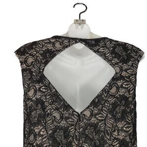 Maggie London Womens Size 6 Prom Dress Beige Black Floral Lace Overlay Event, Cut out back. Knee Length. In good, pre-owned condition with no noted rips, tears or stains. Measurements in description and in pictures with ruler. Please see pictures as they are considered part of the description.