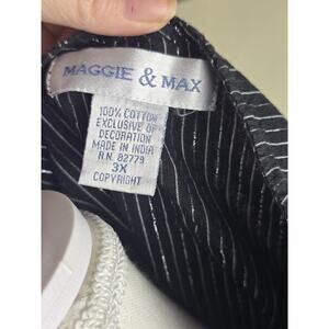 The Maggie & Max Black Embroidered Striped Metallic 3/4 Sleeve Top in size 3X is a stylish and versatile addition to any woman's wardrobe. This pullover blouse features a split neck, lightweight and breathable material, and the comfort of 3/4 sleeves. The embroidered accents and metallic theme add a touch of flair, perfect for casual or travel occasions during the warmer seasons. Made of 100% cotton, this top is easy to care for with machine washable instructions. Designed by Maggie & Max, this top offers a regular fit for a flattering silhouette.