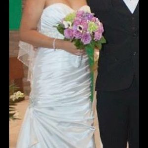 Selling my wedding dress, it's in good conditions. Paid a little bit over $1,200. Size 12. Corset style, hugs the body very well. Very flattering. Minor alterations done, the dress was long on me and I'm 5'4" I had to wear platform heels with it. It can still be altered to your style!