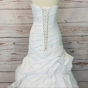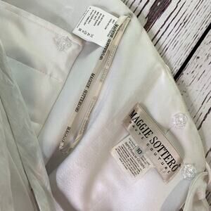 This Maggie Sottero Haute Couture dress in size 10 features a drop waist mermaid trumpet silhouette and a true corset bodice with a lace-up back and a panel. The strapless dress is ruched over the entire dress and has a full tulle underskirt and a long train. It is fully lined and in great condition. Please note that Maggie dresses run small, so it's important to know your bridal size. The dress is priced over $500 so you have the option to authenticate it through Poshmark. I'm open to offers if you don't want to authenticate it.