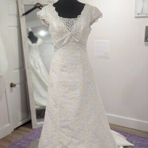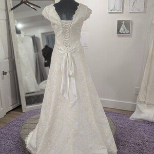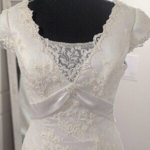 This dress is beautiful, super elegant and graceful, just like Grace Kelly herself. It has a very pretty detail at the neckline, and a satin accent that ties in the back. It is a corset style top so it accommodates different sizes. It is very pretty and in excellent condition, it was never worn by me. I bought it here on Poshmark and then ended up going with a different dress. Cap sleeves and fitted bodice. Flared skirt with intricate detailing.