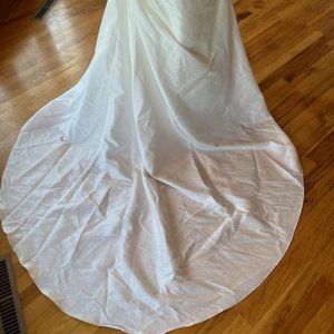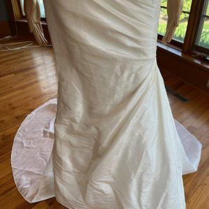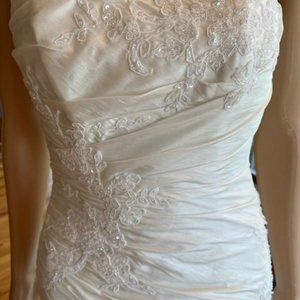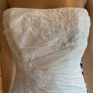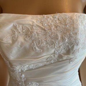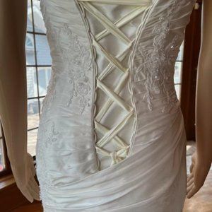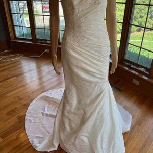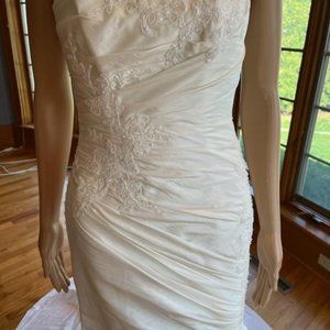 This is a gorgeous gown by Maggie Sottero. The gown is in an ivory taffeta. It is a strapless fitted & flared design. The gown has beaded lace appliques on the bust, sides and back. The gown has a corset style back. The gown flows into a chapel length train. Beautiful!