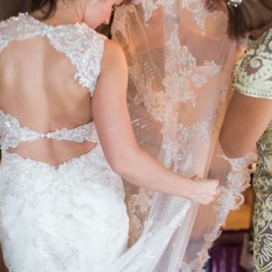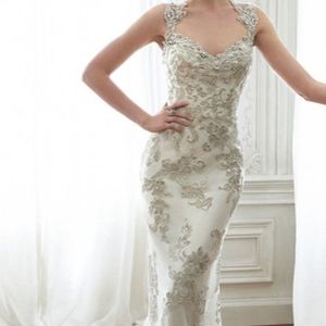 GORGEOUS Maggie Sotero Jade dress, with beautiful ivory/ pewter beeding and a double keyhole back. I am 5'7 size 6/8 street size 10 wedding dress size, and I wore this dress for my beach wedding. I altered the bust to fit 36A cup, i added in push up pads. I also had my seemstress put in a button to bussle the back which looked really great. Website for original dress is https://www.maggiesottero.com/maggie-sottero/jade/8220