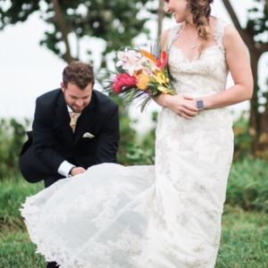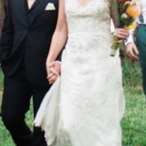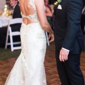 Also. I had the dress altered to fit my height (I needed it shortened), but if you’re taller than me your seamstress could let out what my seamstress folded in and hemmed (she did not cuts off length). I also had a bustle button added in the back so you can let the longer train be long while in the ceremony and then you can button the bustle button for your reception when you want to be able to walk around without stepping on the dress