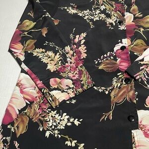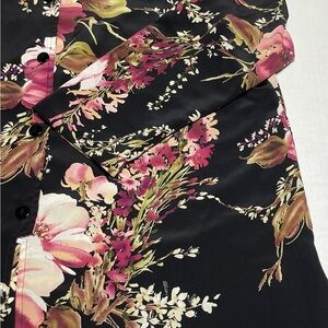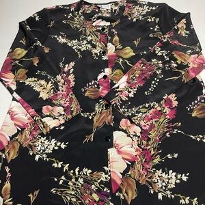 Elegant black blouse with a vibrant floral design. Perfect for any occasion.