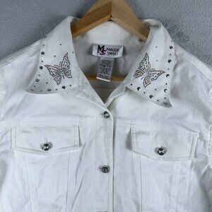 Maggie Sweet Denim Jacket Beaded Butterfly Detail Womens White Size Large Petite